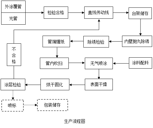 1、3PE生產(chǎn)線進(jìn)管 2、進(jìn)管臺(tái)架 3、直線輸送輥道 4、除塵器 5、內(nèi)噴涂進(jìn)管臺(tái)架 6、鋼管內(nèi)壁除銹設(shè)備 7、過渡臺(tái)架 8、鋼管內(nèi)壁噴涂設(shè)備 9、內(nèi)噴涂出管臺(tái)架 10、直線輸送輥道 11、涂層固化室 12、成品管出管臺(tái)架