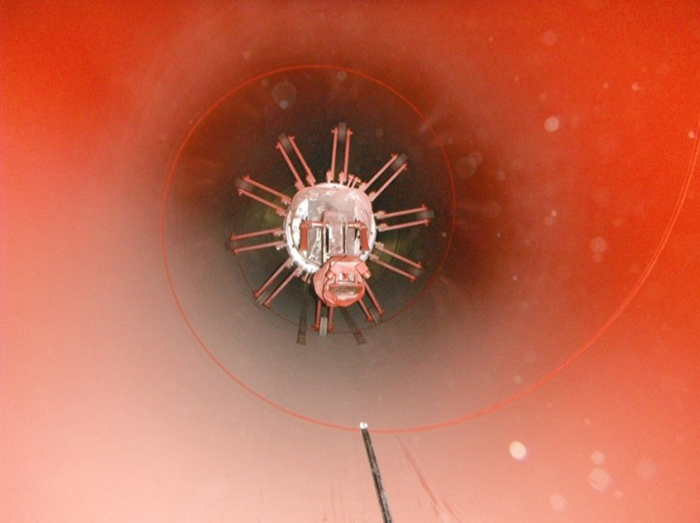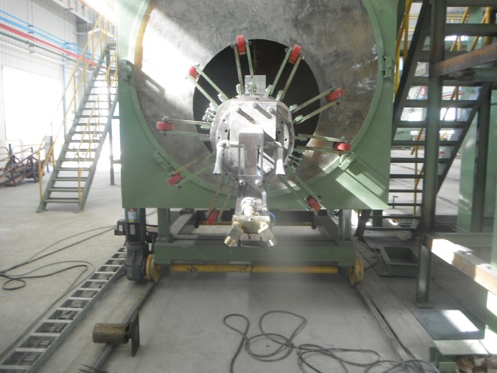 功能描述:內(nèi)壁拋丸除銹系統(tǒng)包含液壓站驅(qū)動(dòng)車、輸砂伸臂、拋頭、提升機(jī)、分離器、回丸系統(tǒng)、打砂前倉(cāng)、轉(zhuǎn)管裝置(或轉(zhuǎn)管車)、打砂后倉(cāng)等。鋼管內(nèi)壁預(yù)熱后(高于室溫3°以上)轉(zhuǎn)運(yùn)到內(nèi)壁除銹工位,前后倉(cāng)將鋼管兩端密封,鋼管旋轉(zhuǎn)。液壓站、提升機(jī)、分離器、回丸系統(tǒng)、輸砂皮帶、拋頭馬達(dá)依次開啟,打開漏砂閥向前移動(dòng)拋頭直至鋼管末端,然后返回到初位置。