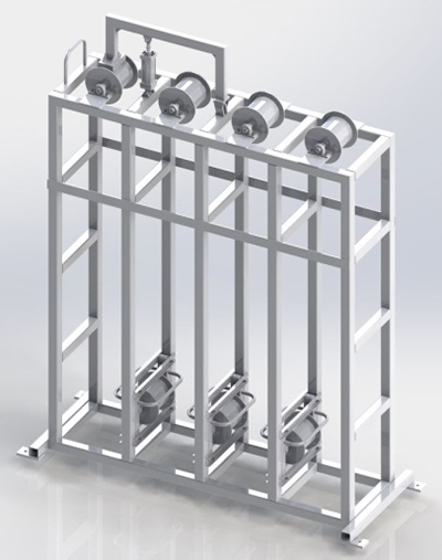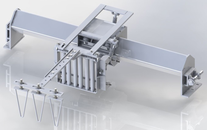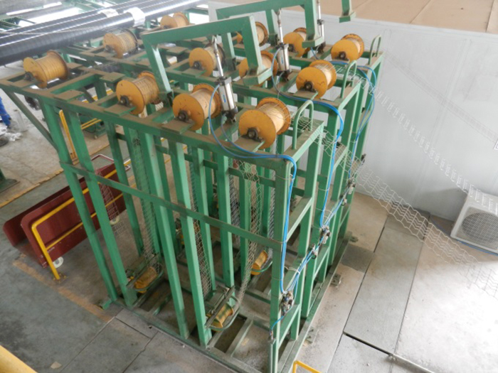 功能描述:放網(wǎng)機(jī)構(gòu)包含放卷機(jī)構(gòu)、張緊機(jī)構(gòu)、纏繞機(jī)構(gòu)等。鋼管在旋轉(zhuǎn)的狀態(tài)勻速前進(jìn)拋射輥前,將鋼絲網(wǎng)掛在預(yù)裝好的掛鉤上?梢杂行У谋WC配重材料附著在鋼管外壁表面。