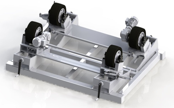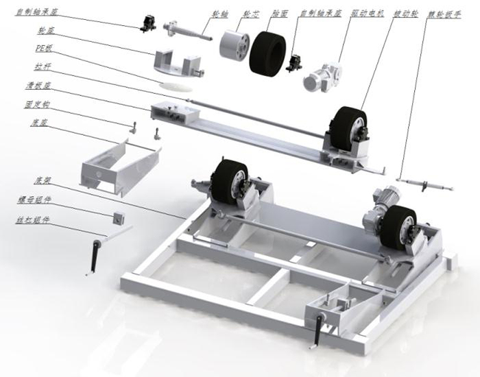 雙輪胎式輸送輥道常用結(jié)構(gòu)為滑板式和孔距調(diào)整式,滑板式螺旋輥道具有管底高不變,輪距無級調(diào)整,集成裝配,便于安裝;滑板式螺旋輥道傳動輪角度采用棘輪調(diào)節(jié);兩輪胎包角大于60度,輪組間用拉桿相連,拉桿可調(diào)節(jié),端部采用桿端關(guān)節(jié)軸承連接,保證輪胎角度調(diào)整的簡便性及統(tǒng)一性,確保傳動線的運行平穩(wěn);輪胎底座下兩配合面之間配1~2mm聚四氟夾層,調(diào)整輪間距時簡捷省力;調(diào)節(jié)精度在調(diào)節(jié)輪組處均配裝刻度尺,以便于觀察。傳動線在調(diào)整完畢后,用鎖緊裝置將傳動線鎖緊。并保證調(diào)節(jié)裝置能夠取下移出。