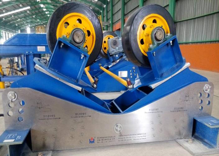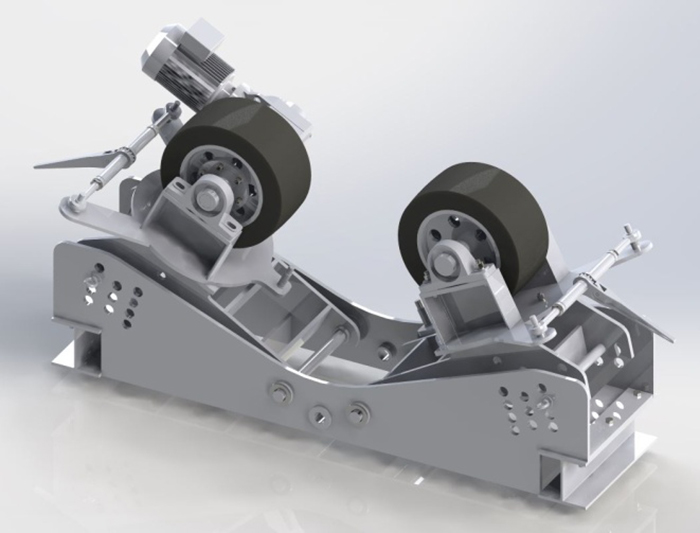 雙輪胎式輸送輥道常用結(jié)構(gòu)為滑板式和孔距調(diào)整式,孔距調(diào)整式螺旋輥道具有管底高變化量小,按鋼管管徑級別調(diào)整的功能,維修維護(hù)方便,變形量小,可用于現(xiàn)場快速撬裝特點。傳動輪角度采用棘輪調(diào)節(jié),兩輪胎包角大于60度,輪組間用拉桿相連,拉桿可調(diào)節(jié),端部采用桿端關(guān)節(jié)軸承連接,保證輪胎角度調(diào)整的簡便性及統(tǒng)一性,確保傳動線的運行平穩(wěn);輪胎底座下兩配合面之間配1~2mm聚四氟夾層,調(diào)整輪間距時簡捷省力;調(diào)節(jié)精度在調(diào)節(jié)輪組處均配裝刻度尺,以便于觀察。傳動線在調(diào)整完畢后,用鎖緊裝置將傳動線鎖緊。并保證調(diào)節(jié)裝置能夠取下移出。